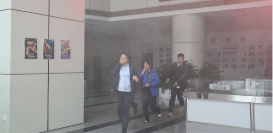 员工们捂住口鼻,有序地从告急出口向外撤退
