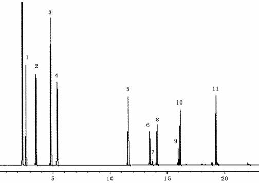 1. 苯 2.甲苯 3.间二甲苯 4.邻二甲苯 5.正十四烷 6.甲苯二异氰酸酯(I)7. 甲苯二异氰酸酯(II)9.己二异氰酸酯 10.异佛尔酮二异氰酸酯(I)11. 异佛尔酮二异氰酸酯(II) 12.二苯二氧化氮二异氰酸酯