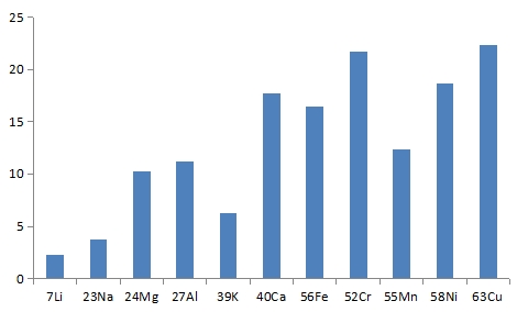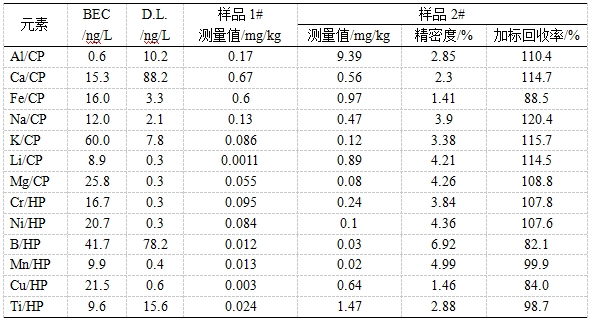 参考《GB/T 32650-2016 电感耦合等离子体质谱法检测石英砂中痕量元素》停止样品前处置。操纵冷焰形式及规范形式对样品停止测试,考查背景等效浓度(BEC)、体例检出限(D.L.)、加标收受接管率、紧密度。背景等效浓度在0.6ng/L~60.0ng/L之间,体例检出限在0.3ng/L~88.2ng/L之间,加标收受接管率在82.1%~120.4%之间,紧密度在1.41%~6.92%之间。
