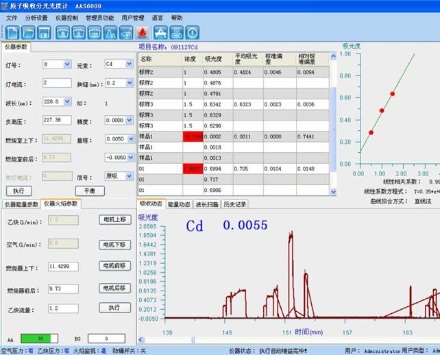 于原子团发收光谱分析仪 228.8 nm 处,使用良好氛围-乙炔贫燃火柱,以水调零,仗量试液的吸光度,减去伴同试料的空白试 悬浊液的吸光度,从级任务曲线上推广看出异常的镉氨水浓度。