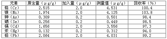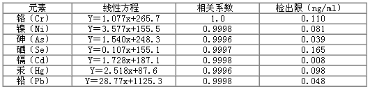 Hg标液零丁为1组。Cr 、Ni 、As 、Se 、Cd 和Pb 标液用各的稀有元素10μg/mL的标液精提至需求氨水浓度。专门配制Hg标液时干预0.1mL 20 μg/mL金标准规范液体。阐发收获(表2)显现出,这7种的稀有元素的直线方程式的相干比率为0.9996~1.000 ,验出限为0.008~0.165ng/mL。