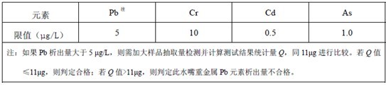 (2)公共卫生学部《营生可饮冲水输配水转备及防范材质原料的公共卫生学鉴定实验室管理标准》第一步对水嘴中镉、铅、砷、汞、铬、铝多种高价属种元素的沉淀量不予受受到限定,别个对彩石材质原料水嘴,充满活力了铁、锰、铜、锌、镍的沉淀量受受到限定要求,受受到限定要求如表2图示:
