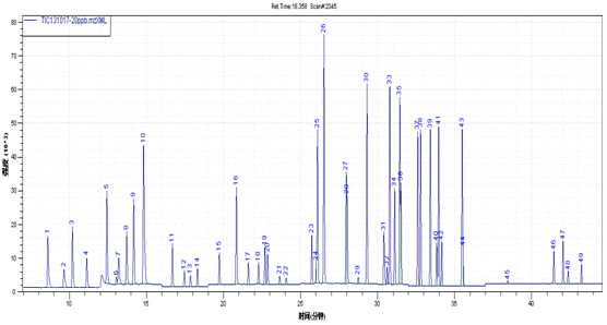 图2. 54种(zh🏅ong)挥发性无机物(VOCs)规(gui)范𝐆物资(zi)在SIM形式(shi)下的TIC图
