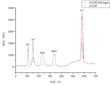 湖水检样及加标1µg/L的自测成绩详情表4,检样及加标后砷图型增加谱图如同5图示。