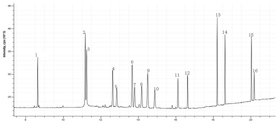 图(tu)1. 16种硅酸磷(lin)规范化硫酸铜溶液TIC图(tu)