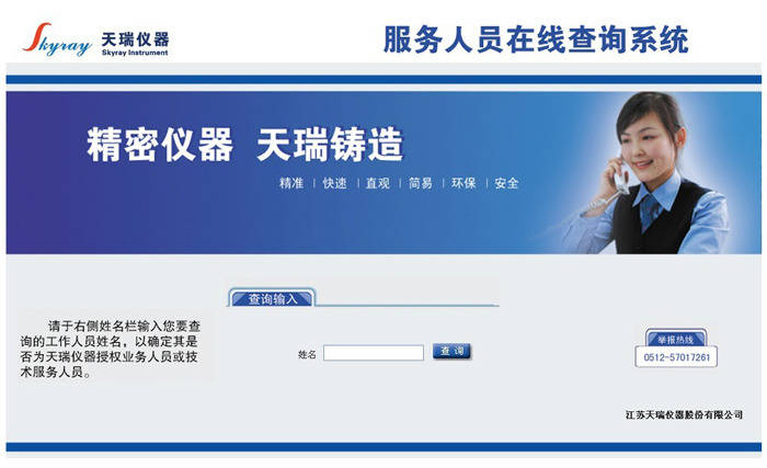 颠末2个月的筹办任务,天瑞仪器“办事职员在线查问”系统本日投入试运转,该系统涵盖了天瑞仪器退职的发卖和手艺办事职员的根基信息,经由进程该查问系统,客户可以或许随时查问上门办事的发卖或手艺办事职员相干信息。